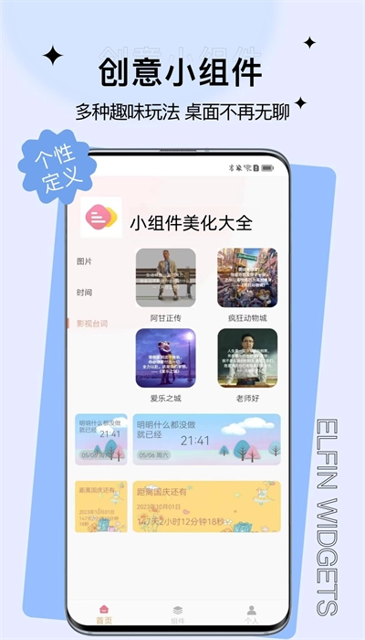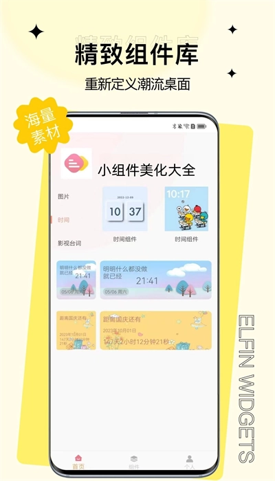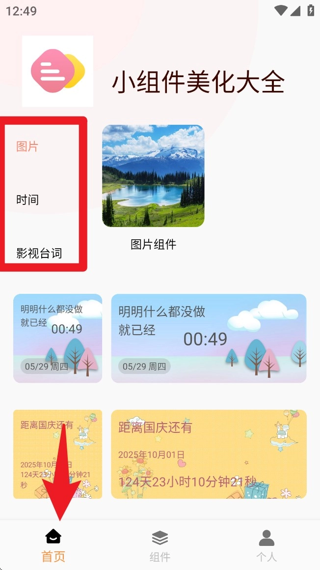 1. 开启应用后,默认会进入首页。在此页面,你能够从左侧挑选图片、时间、影视台词等模块,进而自定义你心仪的组件类型。