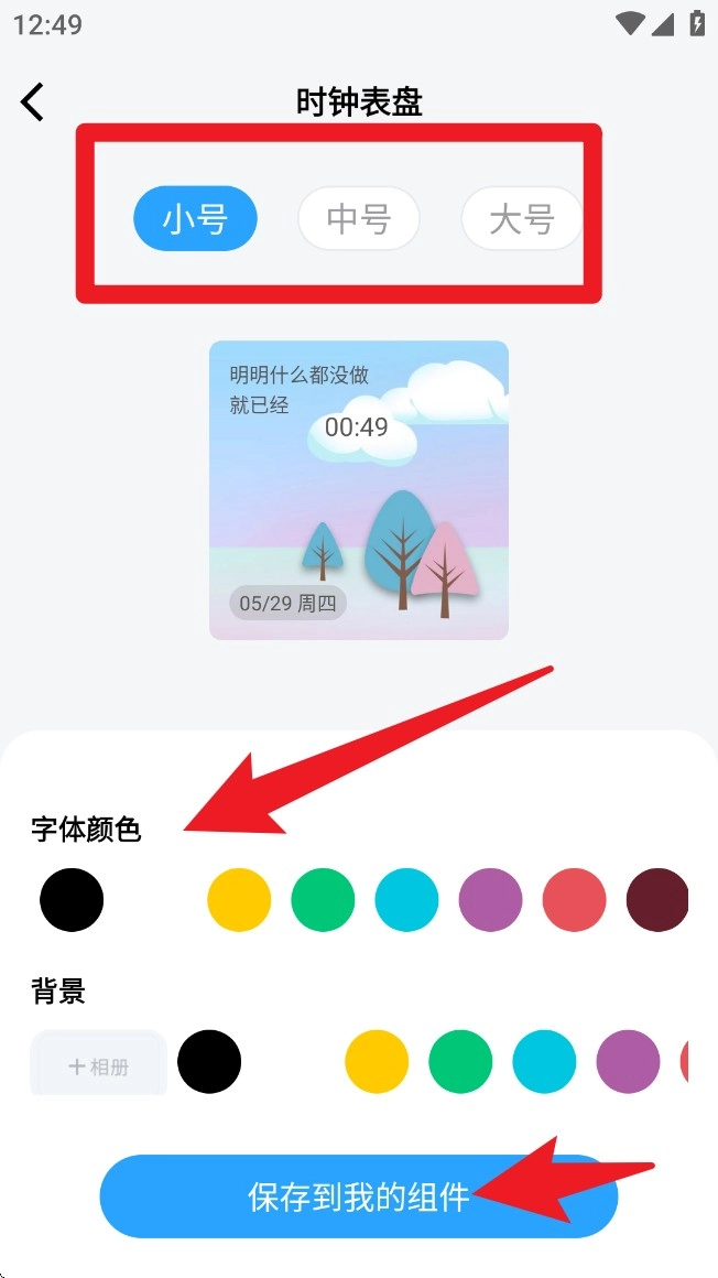 2. 在“时间”模块内,能够自由切换字体大小,对字体颜色和背景配色进行设置,点击“保存到我的组件”即可完成配置。
