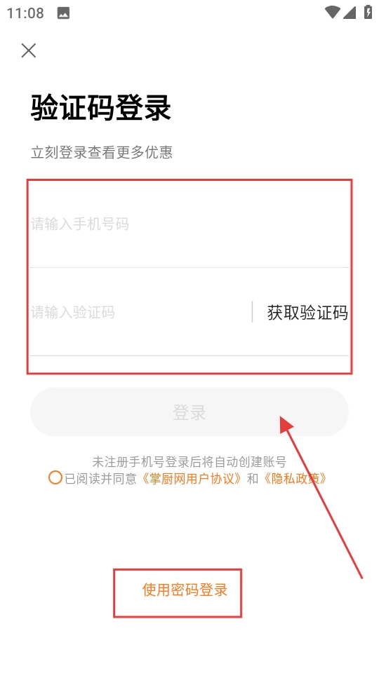 2、可选验证码登录,填手机号,验证码后登录,也可选使用密码登录。