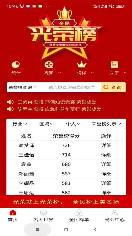 此外,全民光荣榜APP为用户打造了名人世界,在线即可浏览众多名人信息,深入知晓名人详情,使用户能高效掌握名人资讯,享受贴心服务。而且,通过这款APP,用户可以详细了解各个光荣榜单人员的得分情况,清楚大家获得荣誉的状况,方便用户向他们学习借鉴。