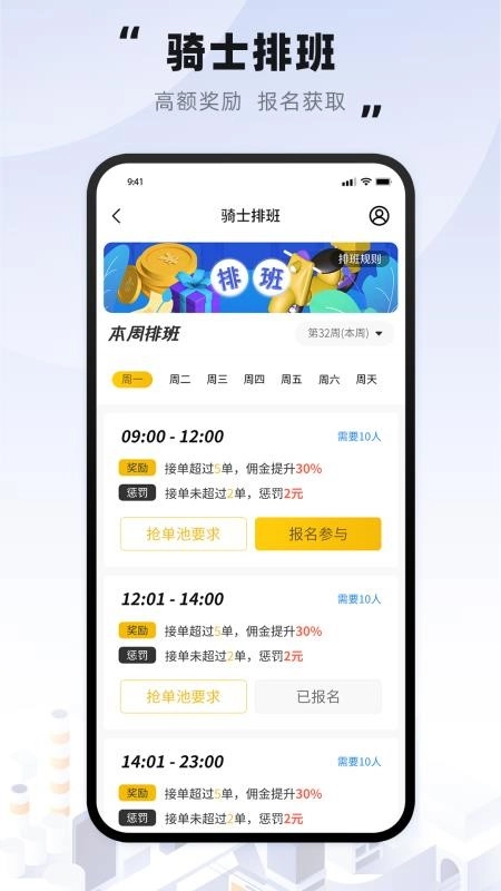3、同时也能助力骑士在线查询每周的排班信息,通过报名参与排班来规划时间。