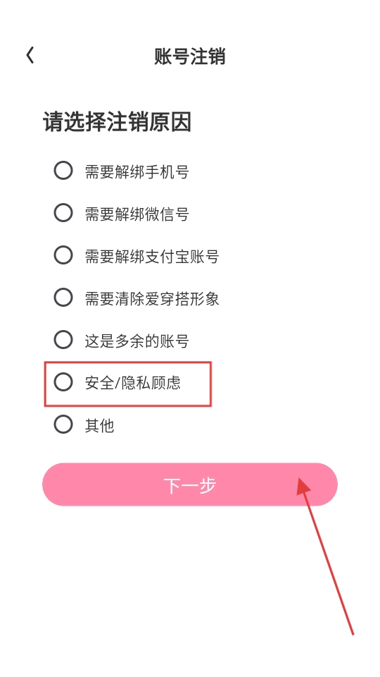 3、在账号注销页,根据自身情况选注销原因后点下一步。