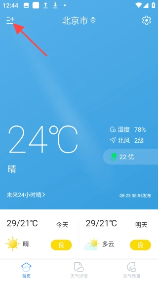 2、进入首页,查看当前位置天气信息,点击左上角图标。