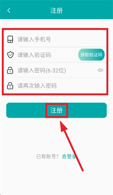 输入手机号,验证码,密码,点击注册即可