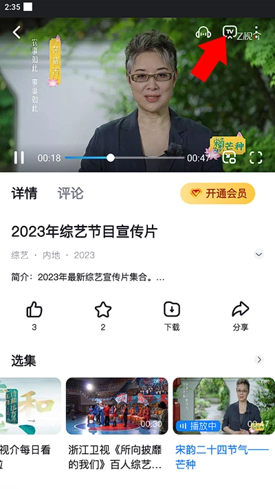 2、接下来,我们打开中国蓝TV,选择任意想要投屏的视频内容并点击,接着点击播放窗口右上角的“tv”图标。