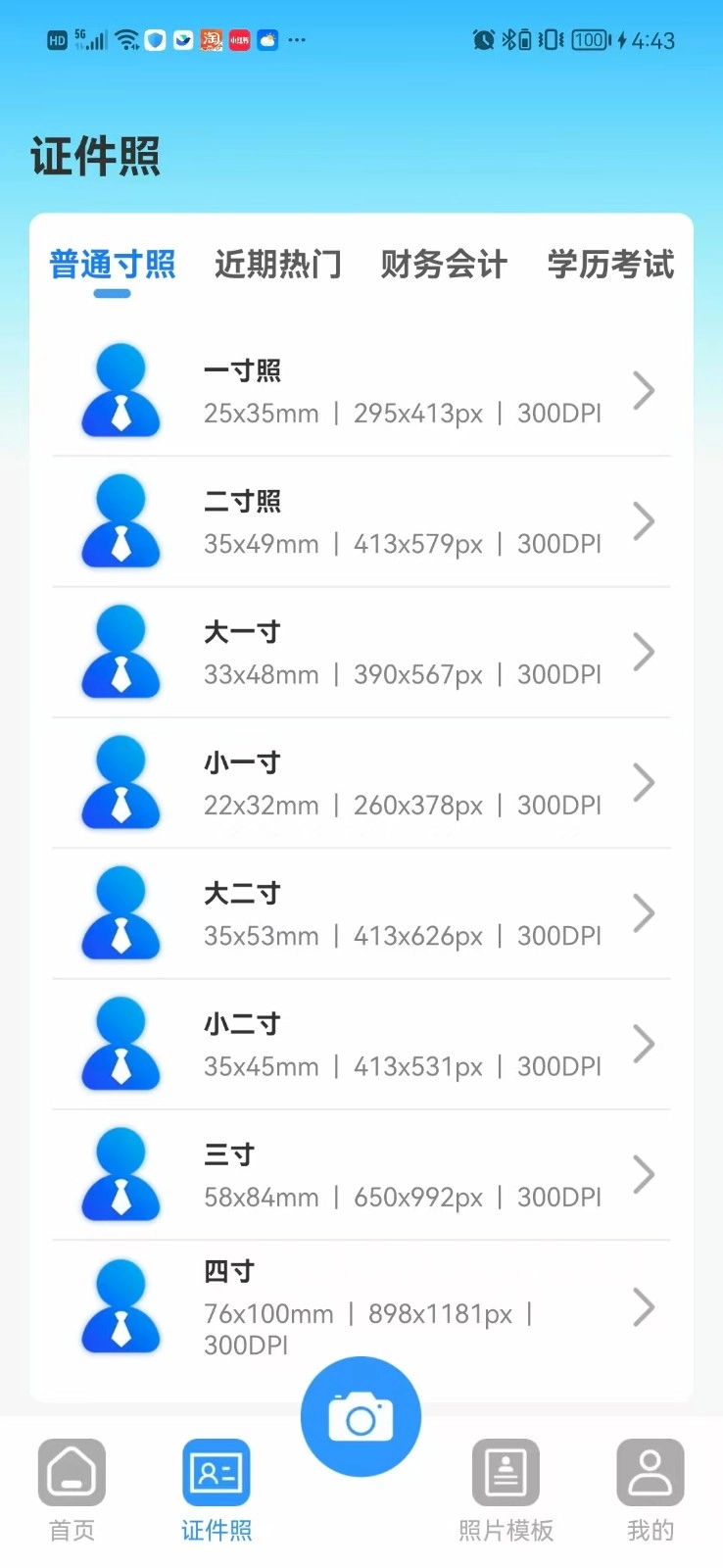 2、在证件照页面中有普通寸照、近期热门、财务会计有学历考试等版块;