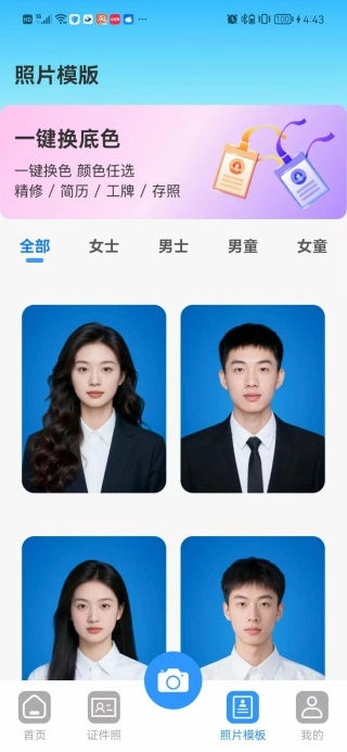 3、照片模板支持一键更换底色,还设有女士、男士、男童、女童等不同版块。