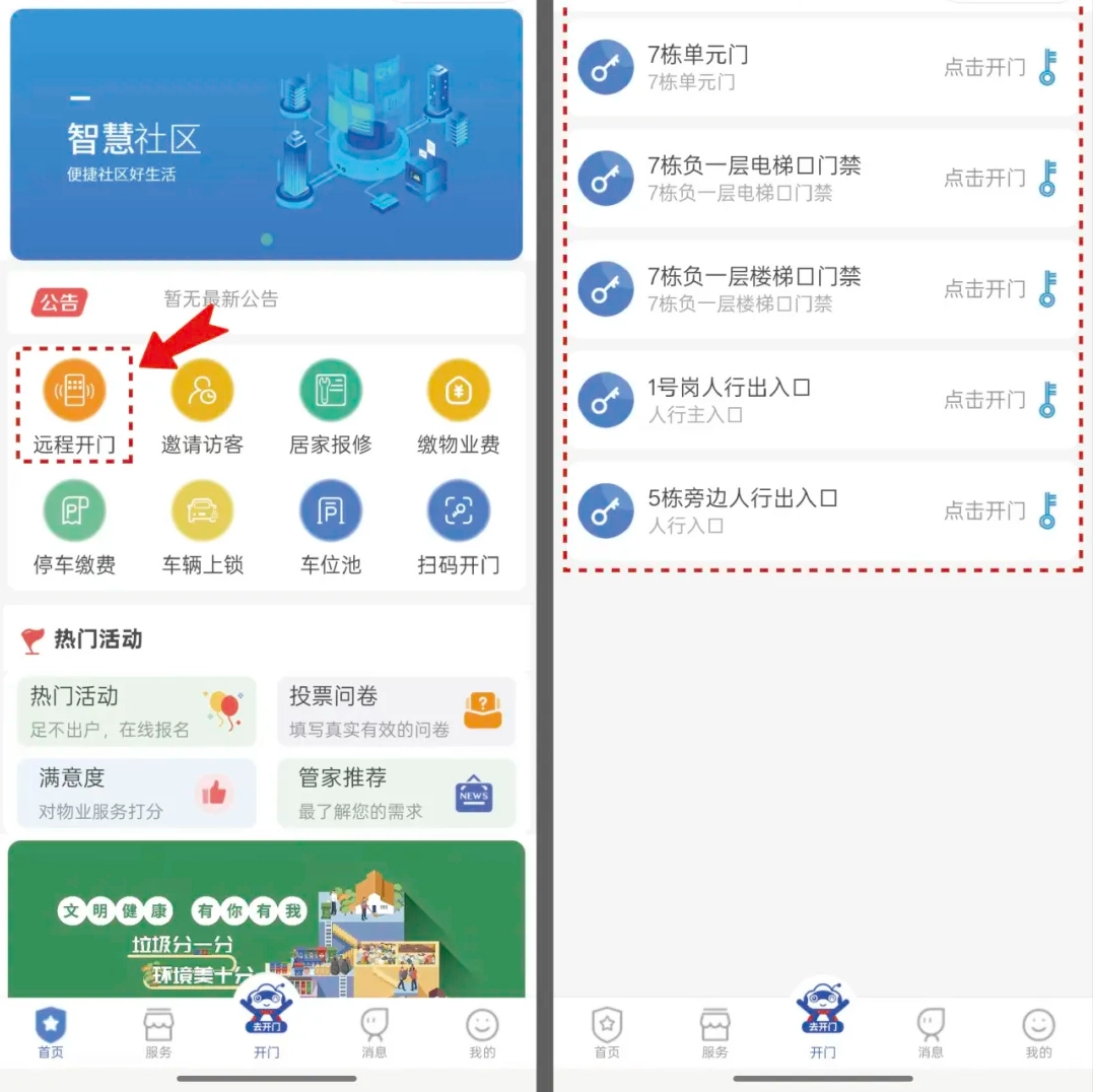 在首页点击“远程开门”,就能查看小区出入口以及房屋所在楼栋的全部门禁信息,点击“开门”按钮,即可一键完成开门操作。