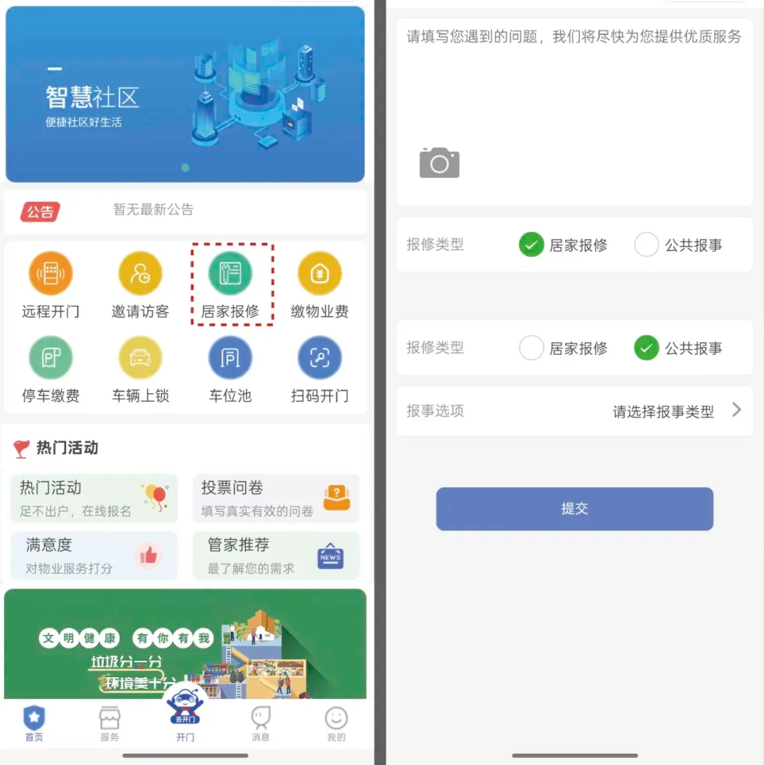 若您在家中或园区里遇到需要报事报修的情况,除了联系专属私人管家外,还能通过以下操作完成:点击首页,进入居家报修界面,选择报修类型,简要描述所遇问题并上传现场图片,我们会迅速安排工作人员处理。