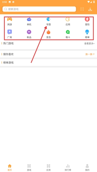 2、在首页上方分类中,选择专题按钮,进入游戏应用专题页面。