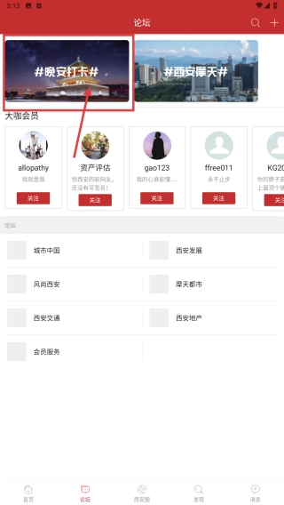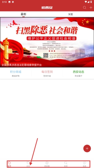 1、打开悦西安应用,点击底部论坛选项,进入论坛页面。