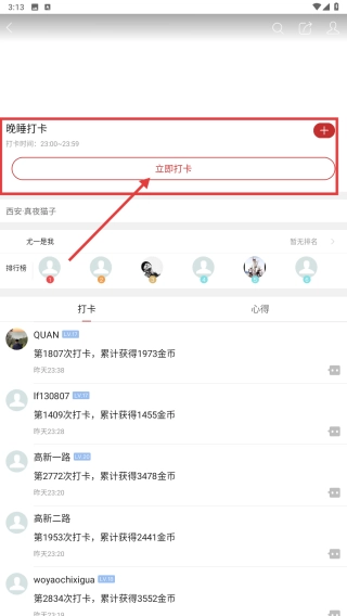 2、在论坛页面,选择#晚睡打卡#话题卡片,进入打卡活动界面。