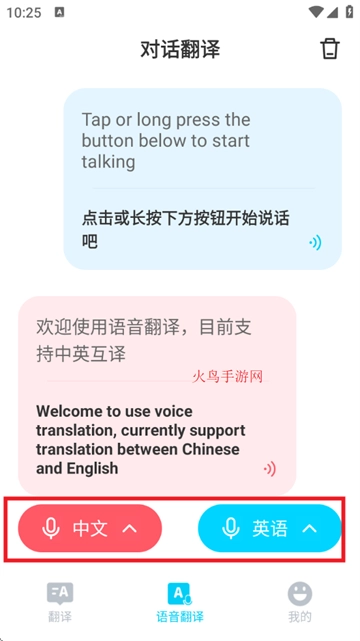 3、语音翻译功能:若需将中文翻译为英文,长按说话按钮说中文,系统会自动将所说内容转写成英文。