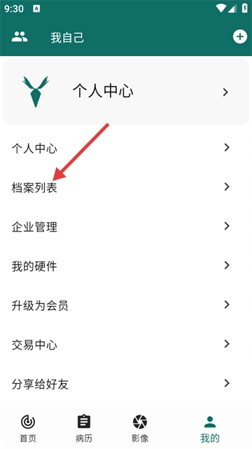 2. 在个人中心页面,点击【档案列表】,进入档案列表页面。