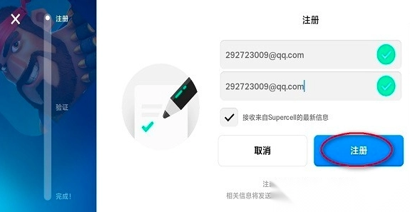 输入邮箱地址,这里以qq邮箱为例子,勾选接收来自Supercell的最新消息,并点击“注册”。