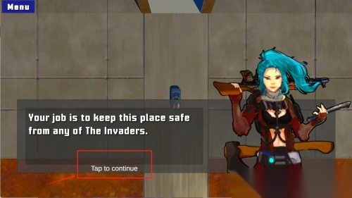 1. 游戏开启时,点击“Tap to continue”进入主界面,查看蓝发角色旁边的任务提示“守护地点免受入侵者侵扰”,以此了解基础游戏目标。