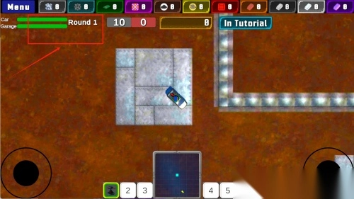 3、在第三张图的方格场地中,使用底部数字键1-6选择武器或道具,通过左右圆形操控区驾驶车辆沿亮线区域移动,完成首轮教程任务。