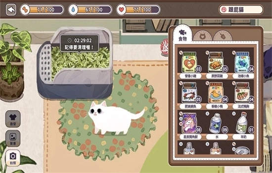 5、等带回猫咪后还能帮它们取名字。接着从左下角按「饲养」,点击进去后最上面可以看到猫咪的状态,看看你的猫饿不饿,渴不渴还有心情如何,依照猫咪的情况我们就可以将食物、道具或猫砂拖曳到猫的身上,但有时候喂食,主子还不一定会吃呢,毕竟每只猫的口味也是不一样的。