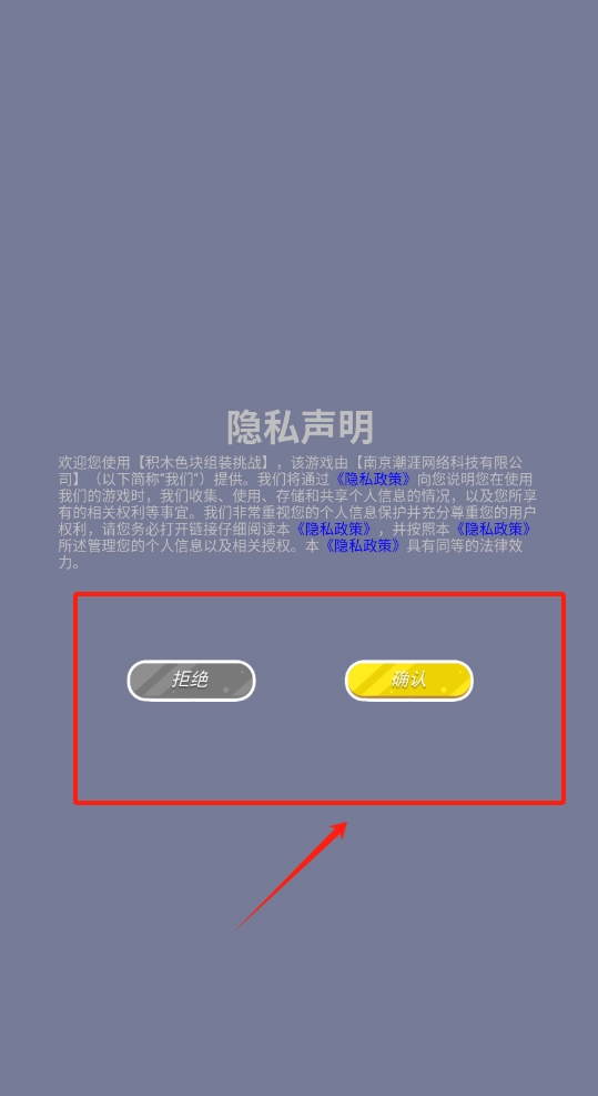 1. 若同意隐私声明,点击黄色的确认按钮;若放弃游戏,点击灰色的拒绝按钮。