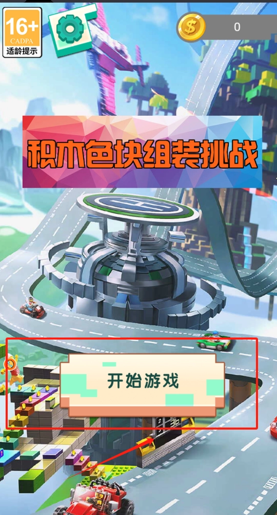 2、点击开始游戏按钮进入积木组装挑战,金币数量显示为0。