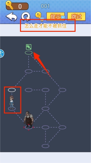 3、通过滑动屏幕控制角色移动,规划最佳逃脱路径避开追捕。成功抵达终点旗帜处会触发庆祝动画,并解锁新难度关卡。