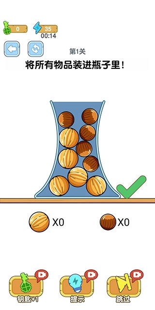 5、要是没办法把所有物品都装入瓶子,导致物品凸出瓶子或者掉落,那么就会失败。