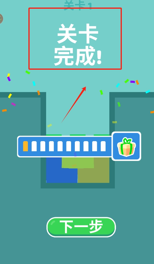 3、瞧见关卡完成和飘落的彩色纸屑,点底部绿色下一步按钮进入下一关继续玩。