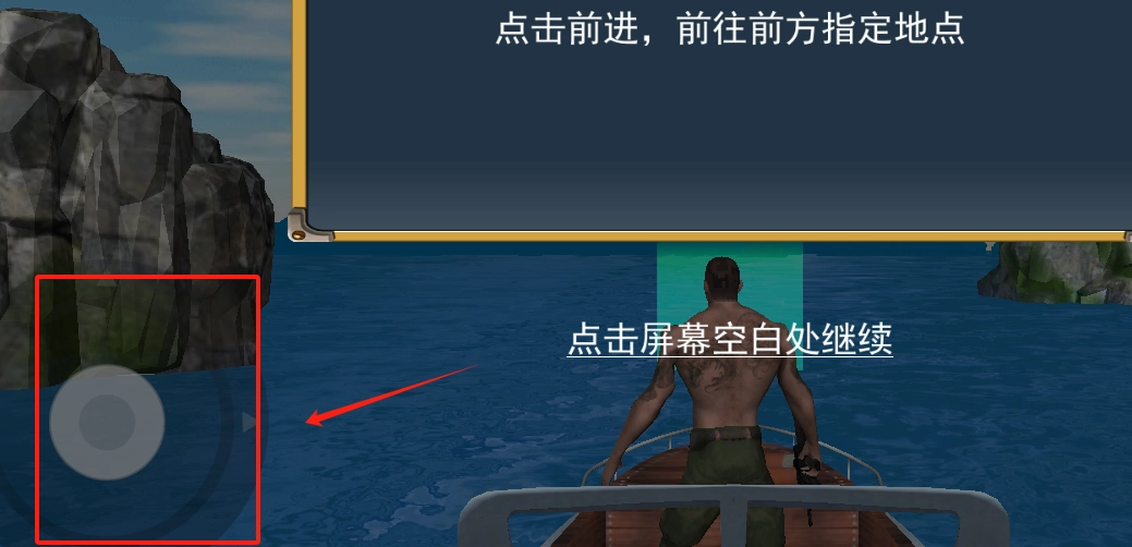 3、瞧见男子坐在船上和屏幕提示,点空白处继续游戏,再点下方圆形按钮就能前进啦。