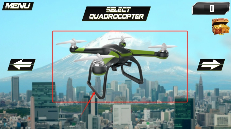 2、用左右箭头选无人机,中间红框里是当前机型,右上0是金币数。