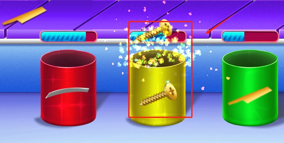 3、三个彩色罐子装工具,按顺序点它们给飞机装零件,进度条会显示完成情况。