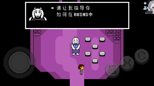 进入上方房间时,Toriel会主动帮助解开谜题,玩家只需穿越北门即可继续前行。