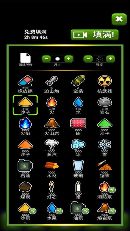 2、道具栏中应有尽有,添加点岩浆,种上些树木,看着小人在你打造的世界里四处跑动,别提多有趣了。