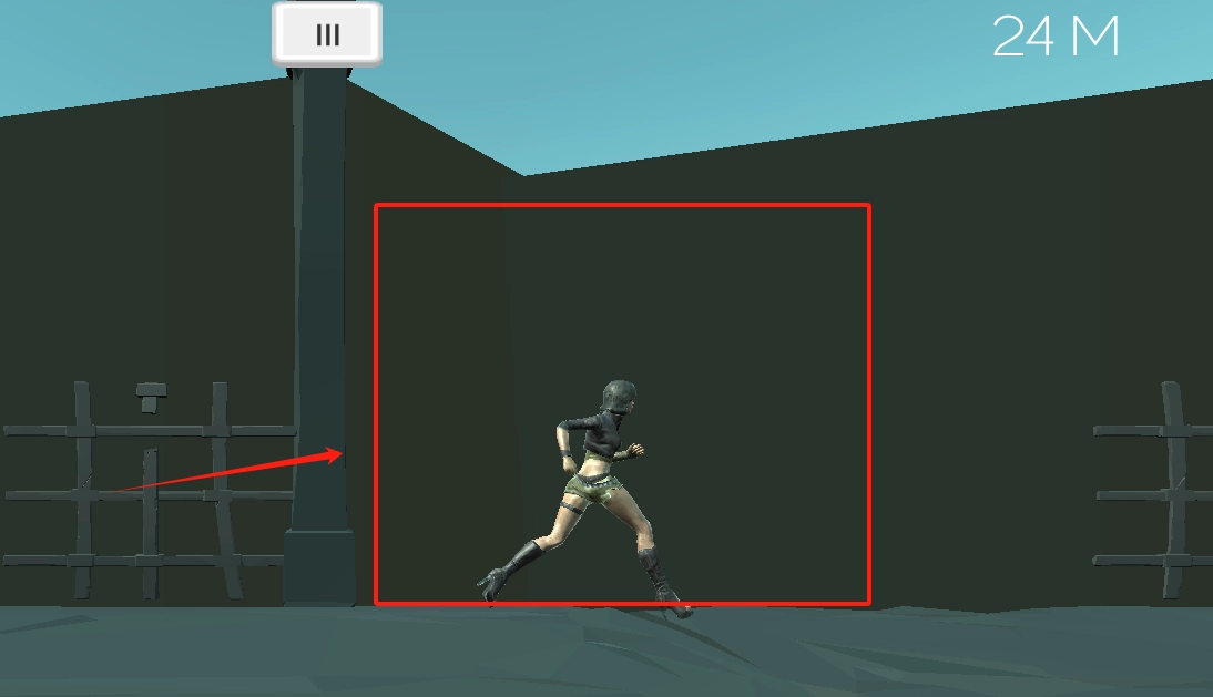 2、显示角色正在奔跑,右上角有24M倒计时,红色方框提示需控制人物躲避障碍物到达终点。