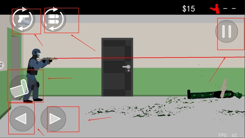 2、左边是我们的移动按钮,玩家需要滑动右侧的屏幕移动射击,左上角是切枪和换弹键。
