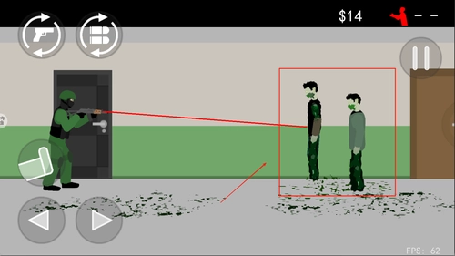 3、玩家需要移动到有敌人的地方,需要移动右边屏幕瞄准敌人射击开火。
