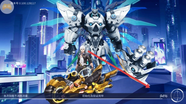 1、等待“初始化及验证完毕”(94%),进入游戏,操控机甲角色,探索未来都市,体验战斗玩法。
