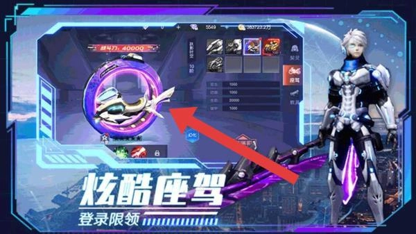 2、在“炫酷座驾”界面,点击箭头指向的机甲座驾,查看属性,登录领取,提升角色战力,备战魔物。