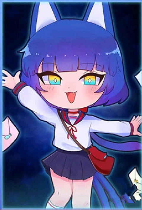 拥有蓝色头发与一对猫耳,身着蓝色短袖上衣和黄色短裤,手上戴着白色手套,在卡牌设定里这身装扮属于校服,性格颇为开朗。