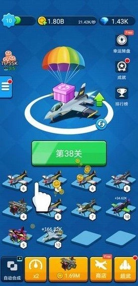 5、合成飞机!高等级飞机航行速度更快,挂机时能产生更多收益,快来加入游戏吧!