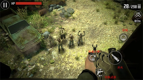 2、在左上角能够随时进行暂停操作。HP红色部分代表自己的血量。在屏幕左侧滑动即可呼出轮盘,通过轮盘来调整枪的准心。