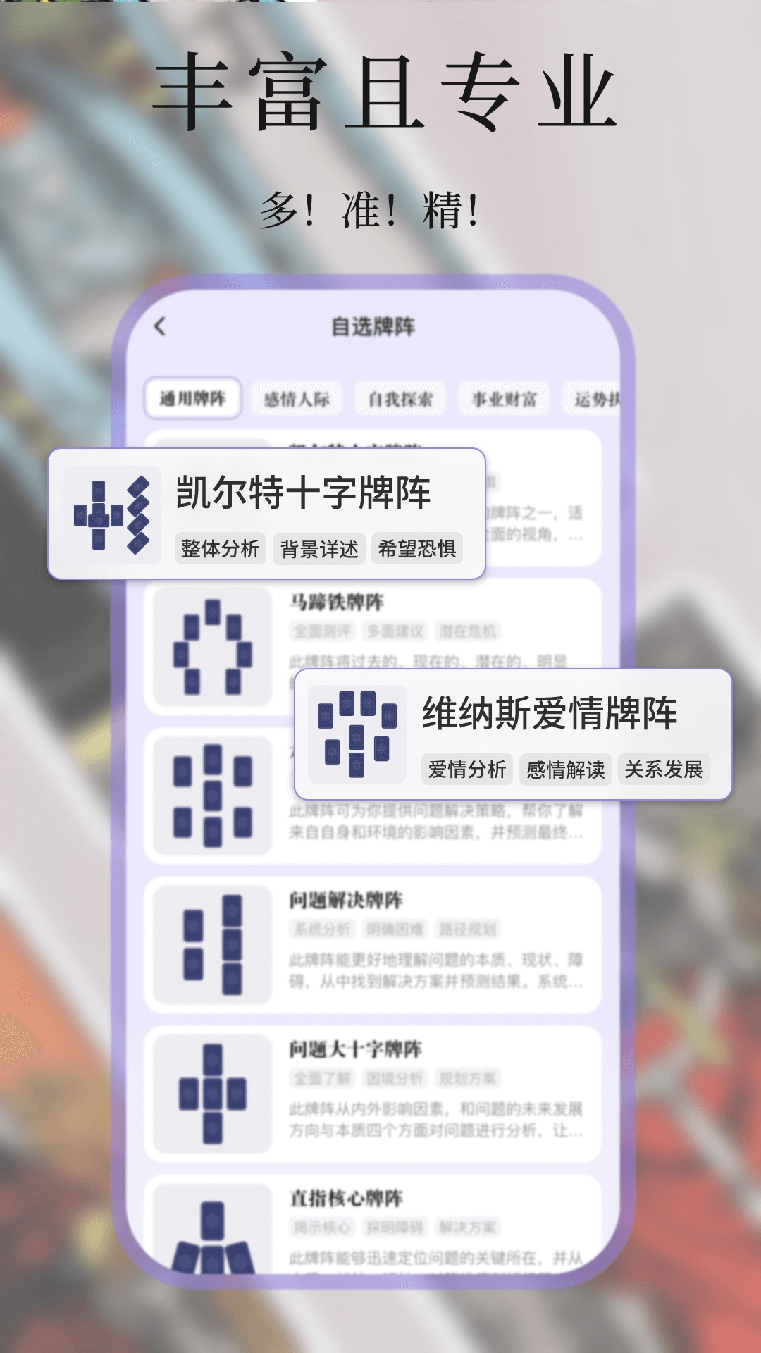 源于传统仪式感的交互,能让牌中的精灵感知到你的能量;而且你无需学习牌阵知识,AI会为你挑选出最适配的牌阵。