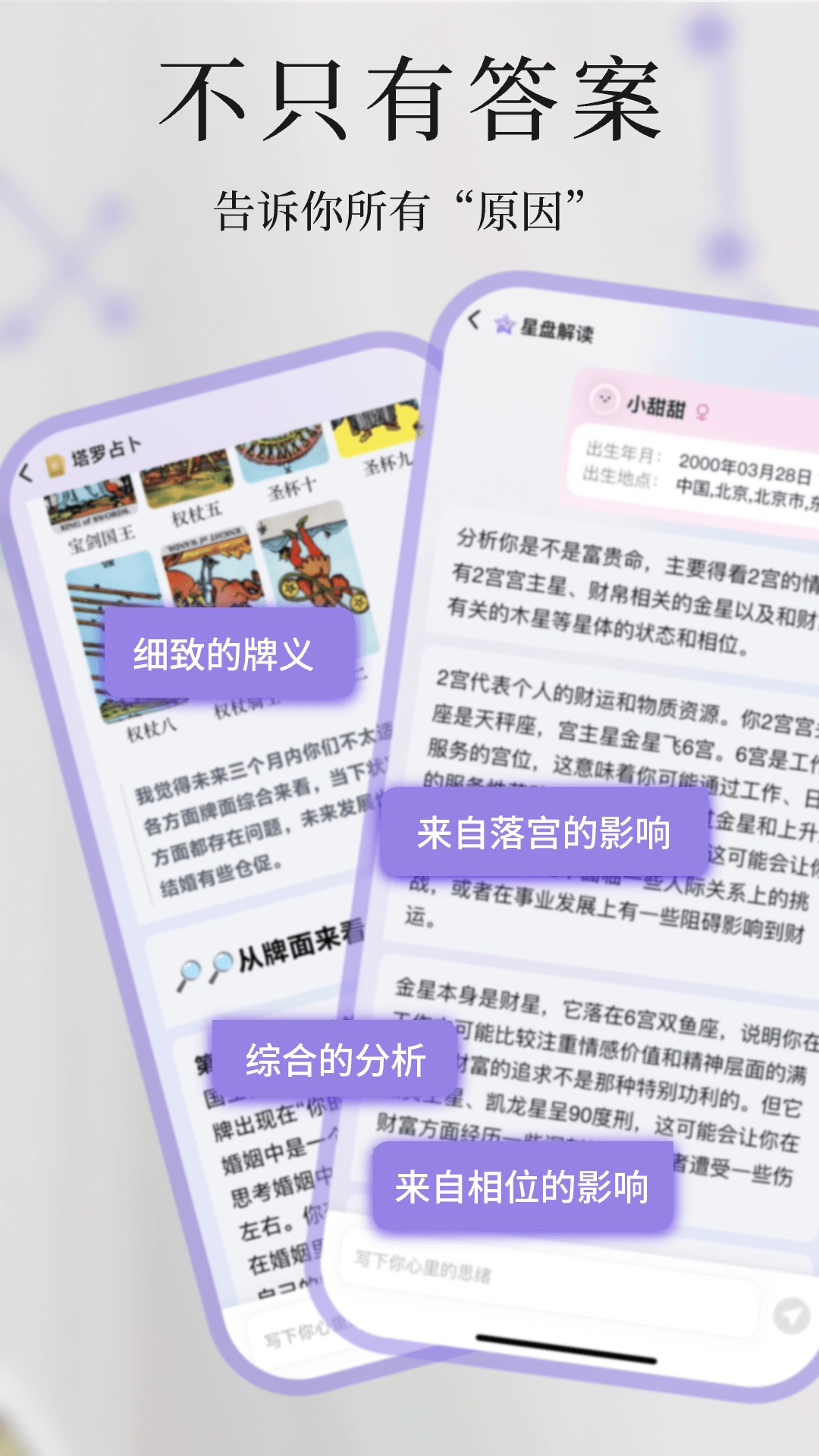或许你始终没能看懂星盘,不过这并无大碍。光屿不仅会为你揭晓答案,还会向你阐释那神秘背后的原理。你渴望知晓的一切,都能在心屿寻觅到答案。