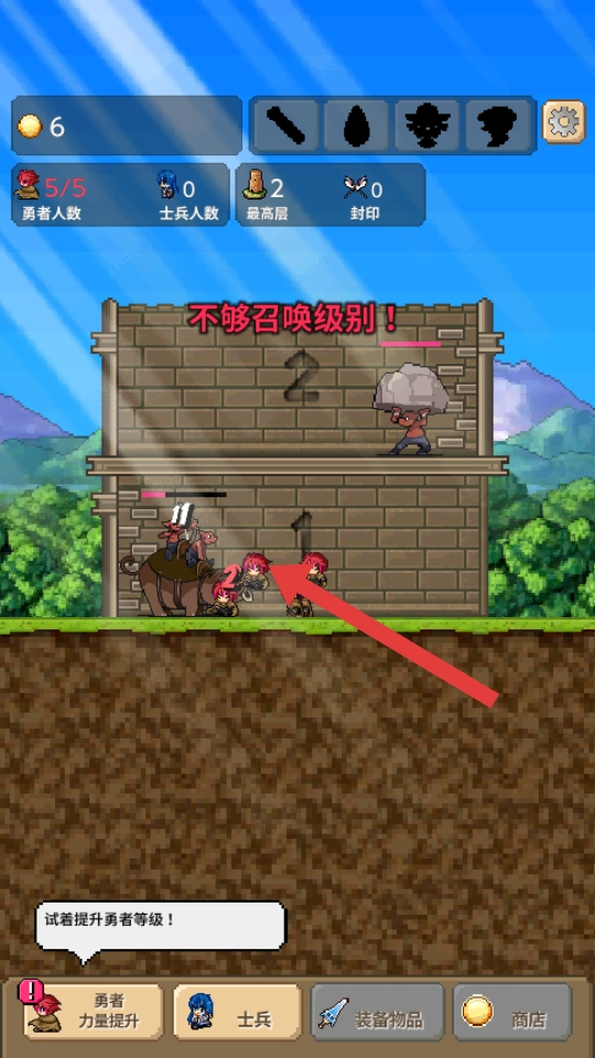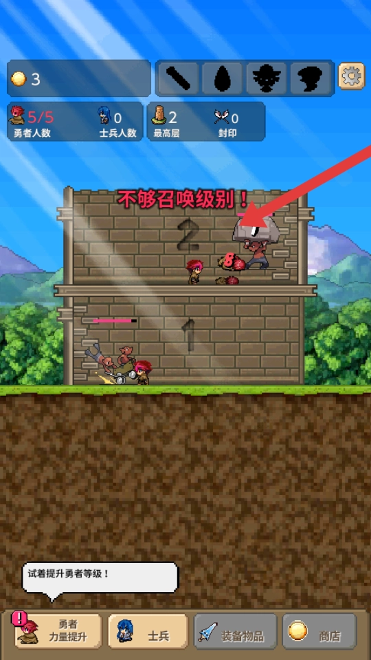 1. 首先留意界面上显示的勇者人数和士兵人数数值。在初始阶段,可通过完成基础闯关任务,比如击败低阶怪物来提升角色等级。
