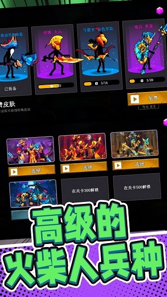 兵种搭配丰富且灵活,玩家能够凭借通关,解锁诸如剑士、弓箭手、法师等更为强力多样的兵种。