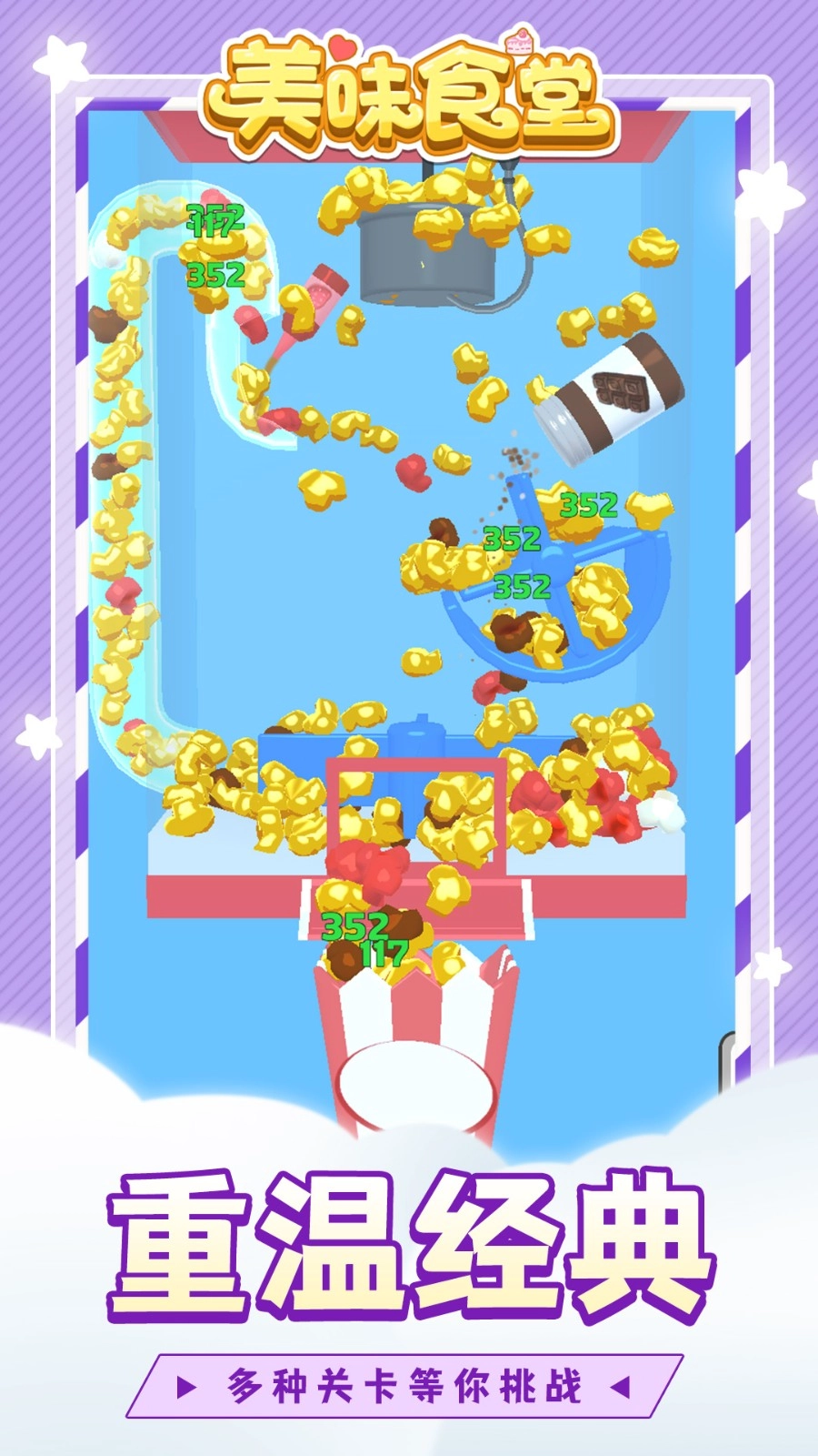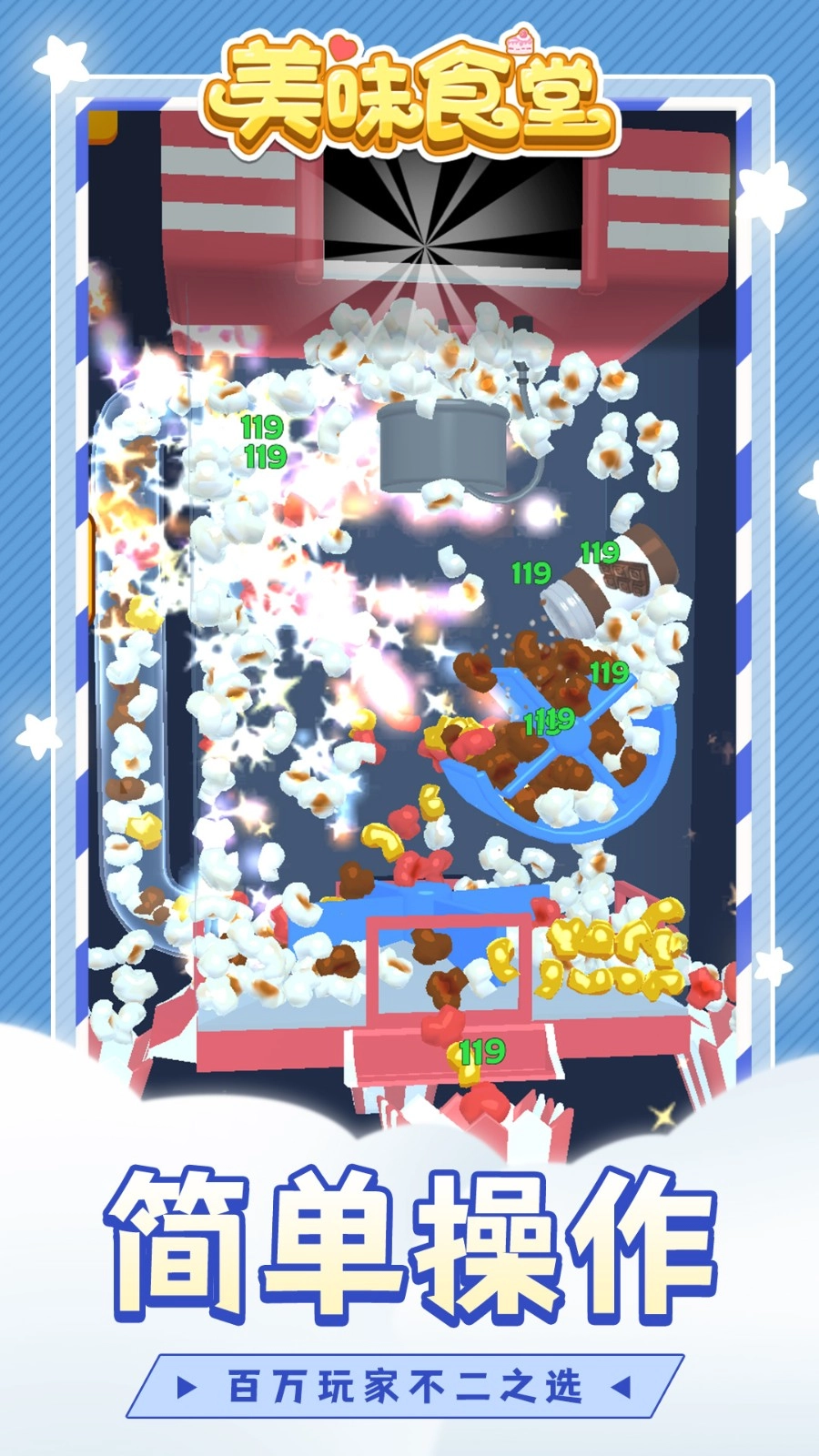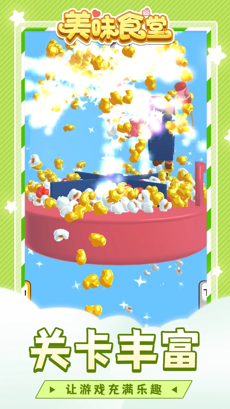 美味食堂是一款以卡通风格打造的休闲放置类游戏。在游戏里,玩家要操控爆米花机器,持续制作出各种爆米花,以此完成关卡挑战与相关任务。在闯关进程中,超多玩法会不断解锁开启,特别适合打发无聊的时光。而且玩家能沉浸其中,掌握多种不同的技巧经验,完全不用担心会遇到难题。与此同时,玩家还能选择点击机器进行升级,提升整体效率,如此便能更轻松地制作出源源不断的爆米花,提高奖励收益。游戏有着明确清晰的任务目标和关卡设计,任何人都能沉浸其中,通过点击完成各项操作,提升闯关效率。感兴趣的小伙伴快来体验试试吧,趣味满满。