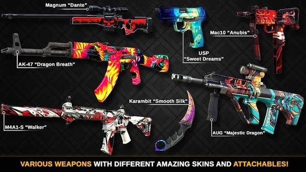 3、拥有炫目的皮肤成就可获得诸多奖励,游戏借鉴经典CS玩法,让您在手机上畅享无尽的移动游戏体验。