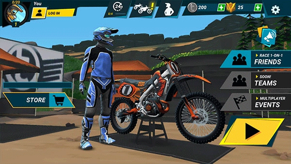 1. 于本站成功安装疯狂特技摩托车3的最新版本后,打开游戏进入大厅页面。在页面左侧,“store”标识处为商店;页面上方分别展示着摩托车型号与车手;页面左上角则是个人中心,点击进入即可查看详细信息以及战绩。