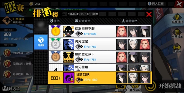 若想查看当前本服内的排名情况,在异人联赛的对战页面,点击右上角的“联赛排行”即可。不仅如此,在排行榜页面,我们还能够知晓本服头名的顶级大神,以及他们常用的角色,这能为渴望迅速上分的异人玩家,在角色选择方面提供参考。