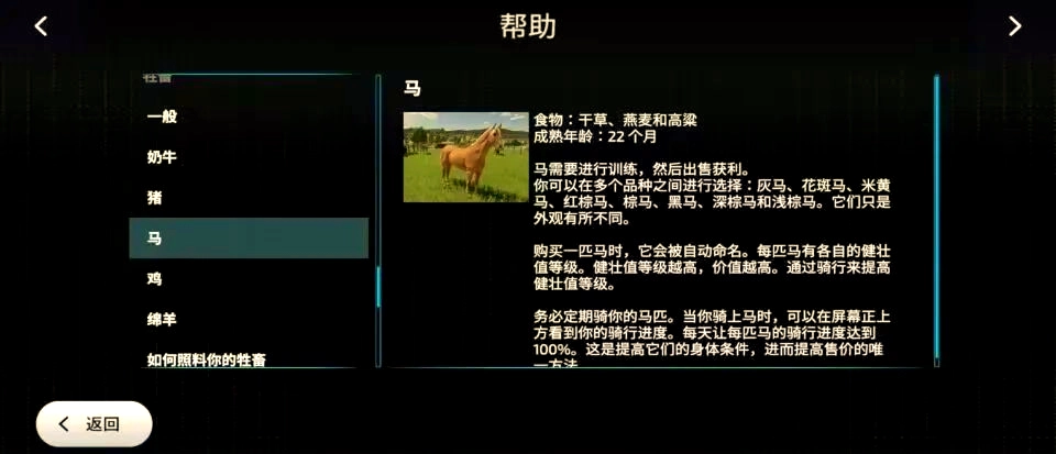 1在游戏里,喂养马匹的流程与照料别的动物相近,然而马的饮食更为特别,主要以燕麦、干草以及高粱为食。而这些饲料都需要玩家亲自种植,再运送到马厩。