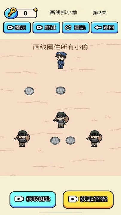2、玩家仅能进行一笔画操作,且务必将所有小偷涵盖其中。